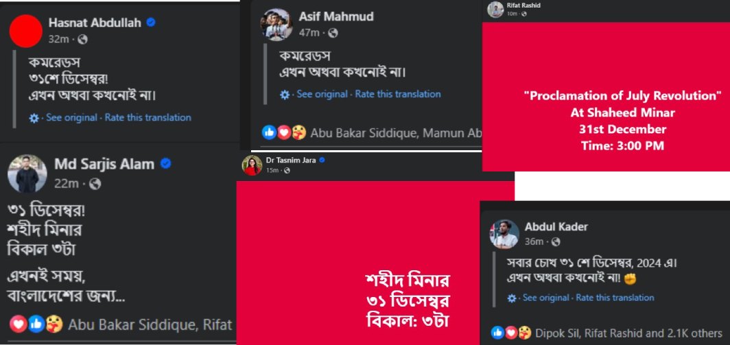 বৈষম্যবিরোধী ছাত্র আন্দোলনের অন্যতম সমন্বয়ক রিফাত রশিদ তার ফেসবুক পোস্টে লিখেছেন ‘All eyes on 31st December, 2024. Now or Never!’