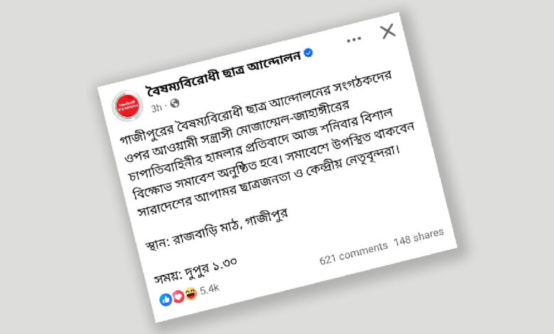 সবাইকে এতে শামিল হওয়ার আহ্বান জানিয়ে বৈষম্যবিরোধী ছাত্র আন্দোলন কমিটি ফেসবুক পোস্টে বলেছে, ‘গাজীপুরের বৈষম্যবিরোধী ছাত্র আন্দোলনের সংগঠকদের ওপর আওয়ামী সন্ত্রাসী মোজাম্মেল-জাহাঙ্গীরের চাপাতি বাহিনীর হামলার প্রতিবাদে আজ শনিবার বিশাল বিক্ষোভ সমাবেশ অনুষ্ঠিত হবে। সমাবেশে উপস্থিত থাকবেন সারা দেশের আপামর ছাত্র-জনতা ও কেন্দ্রীয় নেতৃবৃন্দরা।’