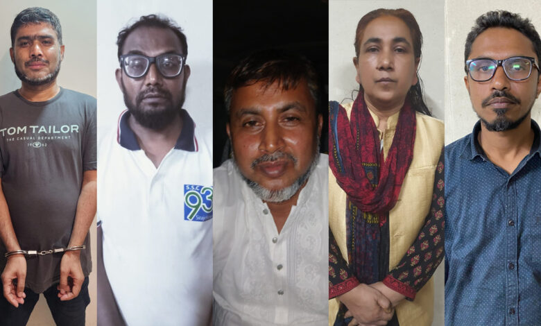 গ্রেপ্তাররা হলেন– শুকতাইল ইউনিয়নের সাবেক চেয়ারম্যান ও শুকতাইল ইউনিয়ন আওয়ামী লীগের সভাপতি এবং গোপালগঞ্জ জেলা পরিষদের সাবেক সদস্য মো. আবেদ আলী শেখ (৫২), রমনা ও হাতিরঝিল থানা মহিলা আওয়ামী লীগের নেত্রী মমতাজ পারভিন শিমু (৪২ ), ছাত্রলীগের সাবেক সহ সভাপতি ও ঢাকা পলিটেকনিক ইনস্টিটিউটের সাবেক সভাপতি এবং মহানগর উত্তর যুবলীগ কর্মী মোহাম্মদ জাকির হোসেন সাগর (৪৩), মিরপুর থানা ছাত্রলীগের ভারপ্রাপ্ত সাধারণ সম্পাদক এম আর বাদল (৫০) ও উত্তরা থানা আওয়ামী লীগের কর্মী মনিরুল ইসলাম (৩৮)।