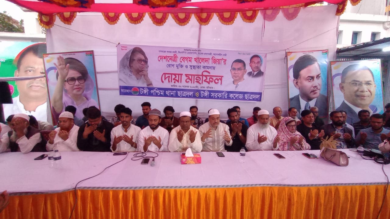 মোঃ পাপেল মিয়া।:বাংলাদেশ জাতীয়তাবাদী দল (বিএনপি)-এর চেয়ারপার্সন ও সাবেক প্রধানমন্ত্রী বেগম খালেদা জিয়ার আশু রোগমুক্তি ও সুস্থতা কামনায় গাজীপুরের টঙ্গীতে দোয়া মাহফিল অনুষ্ঠিত হয়েছে। টঙ্গী পশ্চিম থানা ছাত্রদল ও টঙ্গী সরকারি কলেজ ছাত্রদলের উদ্যোগে রোববার (৩০ শে নভেম্বর) বিকাল ৩টায় টঙ্গীর আউচ পাড়া এলাকায় প্রভাষক বশির উদ্দিনের বাসভবনে এই দোয়া মাহফিল অনুষ্ঠিত হয়।