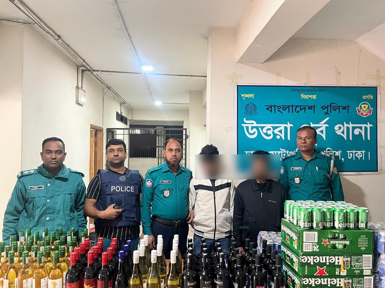 তৎক্ষণাৎ ওই স্থানে অভিযান পরিচালনা করে পুলিশ মোট ৮৪ বোতল বিদেশি মদ এবং ২০ কেস বিয়ার উদ্ধার করে। এ সময় ঘটনার সাথে জড়িত থাকার অভিযোগে শফিউল্লাহ ও দুলালকে হাতেনাতে গ্রেফতার করা হয়।