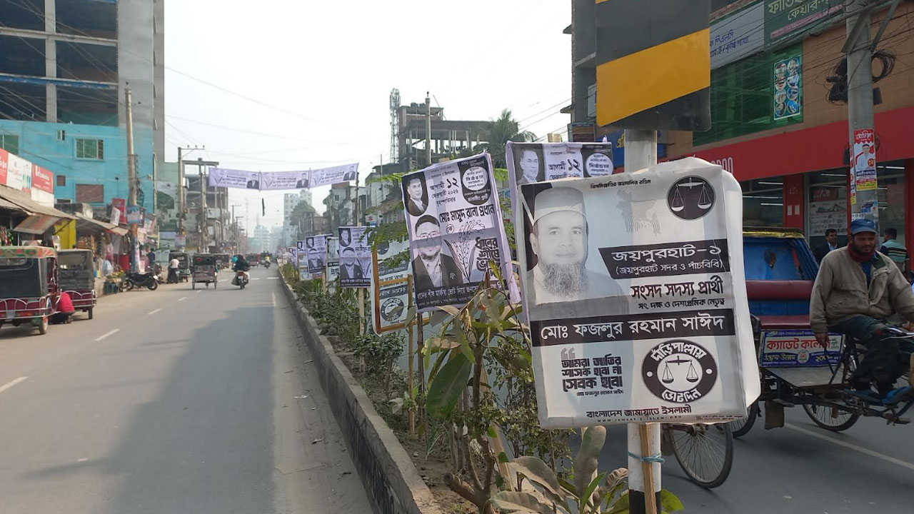 শহরের জিরো পয়েন্ট থেকে বাসস্ট্যান্ড পর্যন্ত ফোর লেন সড়কের বিভাজকে দেখা গেছে শত শত ফেস্টুন। জয়পুরহাট-১ (সদর ও পাঁচবিবি) আসনের বিএনপি প্রার্থী মাসুদ রানা প্রধান ও জামায়াত প্রার্থী ফজলুর রহমান সাঈদের ছবি ও প্রতীক সম্বলিত এসব ফেস্টুন আড়াআড়িভাবে খুঁটি দিয়ে ডিভাইডারের মাটিতে গেড়ে দেওয়া হয়েছে।